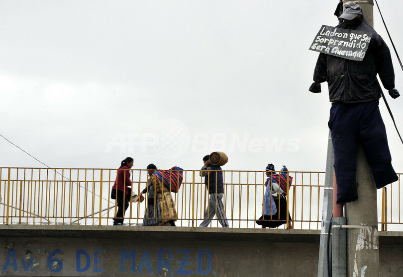 ニュース 社会 街角に犯罪者の指名手配人形、住民による私刑が増加 南米ボリビア 2010年1月29日 18:28 発信地:エルアルト/ボリビア [ 中南米 ボリビア ] このニュースをシェア ‹ › ❮ 3/14 ❯ 南米ボリビア・ラパス(La Paz)近郊の街エルアルト(El Alto)では、多発する犯罪に対する警察の不手際に業を煮やした住民らが、自らの手で犯人に私刑を加える例が増えている。非公式統計によると、2009年には強盗事件の犯人と疑われた15人以上が、住民によって絞首や火をつけられるなどしたという。 写真は、エルアルトの通りに吊るされた犯罪事件容疑者の人形。プラカードには「住民の皆さんへ。この容疑者を見つけたら、近隣住民全員に秘密電話で通報してください」と書かれている(2010年1月14日撮影)。(c)AFP/Aizar Raldes 画像作成中 ! 【1月29日 AFP】南米ボリビア・ラパス(La Paz)近郊の街エルアルト(El Alto)では、多発する犯罪に対する警察の不手際に業を煮やした住民らが、自らの手で犯人に私刑を加える例が増えている。非公式統計によると、2009年には強盗事件の犯人と疑われた15人以上が、住民によって絞首や火をつけられるなどしているという。(c)AFP 社会 一覧へ> メディア・報道関係・法人の方向け 写真・動画 購入のお問合せ>