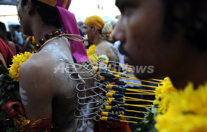 ニュース ライフ ヒンズー教の大祭タイプーサム、鉄串刺して苦行の行進 2010年1月31日 18:38 発信地:シンガポール/シンガポール [ アジア・オセアニア シンガポール ] このニュースをシェア ‹ › ❮ 23/25 ❯ シンガポールで30日、ヒンズー教の大祭タイプーサム(Thaipusam)が行われた。ムルガ(Muruga)神をあがめるこの祭りは、 タミル暦のタイ(Thai)の月の満月の日に行われる。信者らは「カバディ(Kavadi)」と呼ばれる御輿(みこし)を鉄串などで自分の身体に固定して苦行の行進を行う。この祭りはマレーシアでも行われる。写真は、早朝のマレーシア・クアラルンプール(Kuala Lumpur)で、体に刺したフックで「カバディ」と呼ばれる御輿(みこし)を引いてバトゥ洞窟(Batu cave)のヒンズー教寺院に向かうヒンズー教徒(2010年1月30日撮影)(c)AFP/Saeed KHAN 画像作成中 ! 【1月31日 AFP】シンガポールで30日、ヒンズー教の大祭タイプーサム(Thaipusam)が行われた。ムルガ(Muruga)神をあがめるこの祭りは、 タミル暦のタイ(Thai)の月の満月の日に行われる。信者らは「カバディ(Kavadi)」と呼ばれる御輿(みこし)を鉄串などで自分の身体に固定して苦行の行進を行う。この祭りはマレーシアでも行われる。(c)AFP ライフ 一覧へ> メディア・報道関係・法人の方向け 写真・動画 購入のお問合せ>
