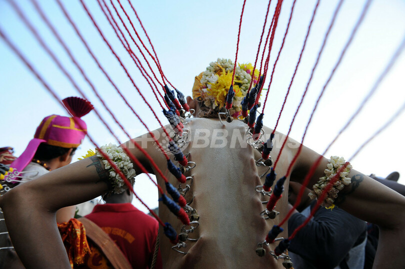 ニュース ライフ ヒンズー教の大祭タイプーサム、鉄串刺して苦行の行進 2010年1月31日 18:38 発信地:シンガポール/シンガポール [ アジア・オセアニア シンガポール ] このニュースをシェア ‹ › ❮ 17/25 ❯ シンガポールで30日、ヒンズー教の大祭タイプーサム(Thaipusam)が行われた。ムルガ(Muruga)神をあがめるこの祭りは、 タミル暦のタイ(Thai)の月の満月の日に行われる。信者らは「カバディ(Kavadi)」と呼ばれる御輿(みこし)を鉄串などで自分の身体に固定して苦行の行進を行う。この祭りはマレーシアでも行われる。写真は、早朝のマレーシア・クアラルンプール(Kuala Lumpur)で、体に刺したフックで「カバディと呼ばれる御輿(みこし)を引いてバトゥ洞窟(Batu cave)のヒンズー教寺院に向かう苦行の行進をするヒンズー教徒(2010年1月30日撮影)。(c)AFP/Saeed KHAN 画像作成中 ! 【1月31日 AFP】シンガポールで30日、ヒンズー教の大祭タイプーサム(Thaipusam)が行われた。ムルガ(Muruga)神をあがめるこの祭りは、 タミル暦のタイ(Thai)の月の満月の日に行われる。信者らは「カバディ(Kavadi)」と呼ばれる御輿(みこし)を鉄串などで自分の身体に固定して苦行の行進を行う。この祭りはマレーシアでも行われる。(c)AFP ライフ 一覧へ> メディア・報道関係・法人の方向け 写真・動画 購入のお問合せ>