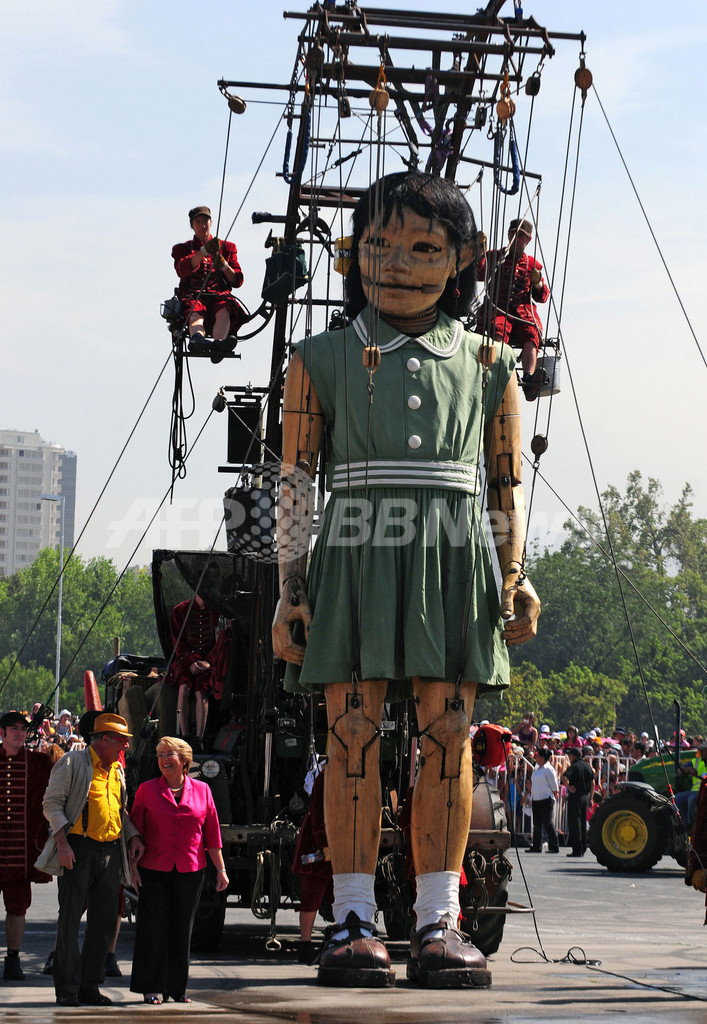 写真は、サンティアゴで公演する「ロワイヤル・ド・リュクス」の巨大操り人形「リトル・ジャイアント(Little Giant)」の下で、言葉を交わすチリのミチェル・バチェレ(Michelle Bachelet)大統領(右)と同劇団の主宰者ジャン・リュック・クールクー(Jean-Luc Courcoult)氏(左、2010年1月31日撮影)。(c)AFP/Claudio Santana