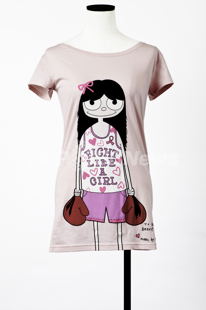 ブランドのイメージキャラクター「ミス マーク」が、赤いボクシンググローブを着けて乳がんに立ち向かうイラストが描かれたTシャツは、昨年アメリカで発売と同時に話題を呼んだ。