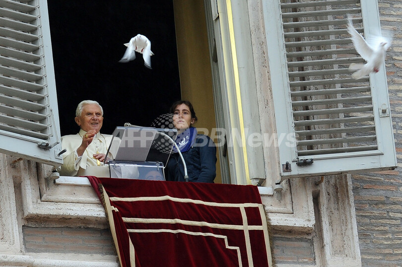 【2月2日 AFP】ローマ法王庁(バチカン)のサンピエトロ広場(St. Peter's square)で前月31日に行われたローマ法王ベネディクト16世(Benedict XVI)による日曜の「お告げの祈り(Angelus)」で、法王の部屋から子どもたちと放った「平和の象徴」のハト2羽のうち、1羽が法王の部屋に戻ってきてしまうというハプニングがあった。(c)AFP