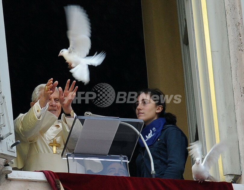 【2月2日 AFP】ローマ法王庁(バチカン)のサンピエトロ広場(St. Peter's square)で前月31日に行われたローマ法王ベネディクト16世(Benedict XVI)による日曜の「お告げの祈り(Angelus)」で、法王の部屋から子どもたちと放った「平和の象徴」のハト2羽のうち、1羽が法王の部屋に戻ってきてしまうというハプニングがあった。(c)AFP