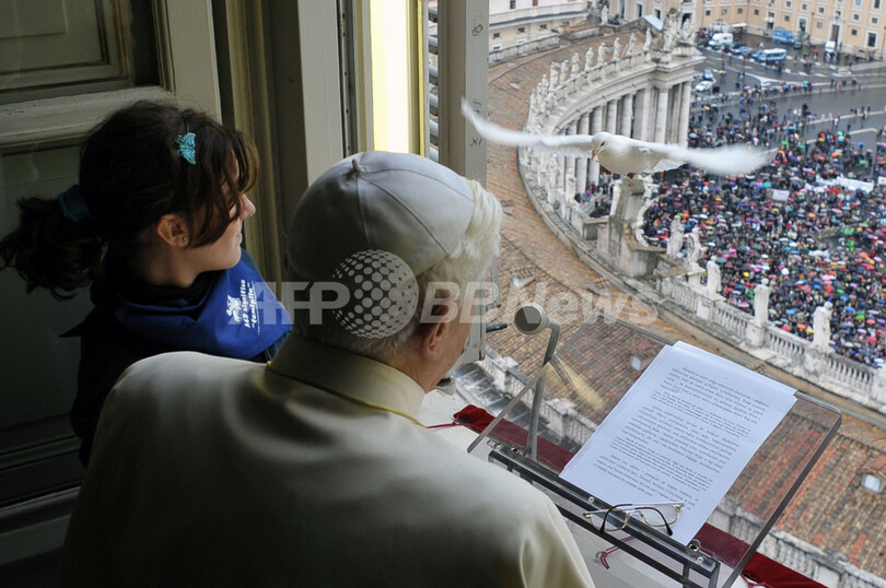 【2月2日 AFP】ローマ法王庁(バチカン)のサンピエトロ広場(St. Peter's square)で前月31日に行われたローマ法王ベネディクト16世(Benedict XVI)による日曜の「お告げの祈り(Angelus)」で、法王の部屋から子どもたちと放った「平和の象徴」のハト2羽のうち、1羽が法王の部屋に戻ってきてしまうというハプニングがあった。(c)AFP