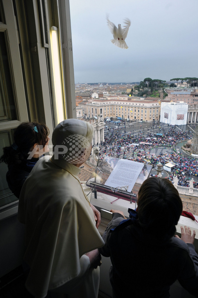 【2月2日 AFP】ローマ法王庁(バチカン)のサンピエトロ広場(St. Peter's square)で前月31日に行われたローマ法王ベネディクト16世(Benedict XVI)による日曜の「お告げの祈り(Angelus)」で、法王の部屋から子どもたちと放った「平和の象徴」のハト2羽のうち、1羽が法王の部屋に戻ってきてしまうというハプニングがあった。(c)AFP