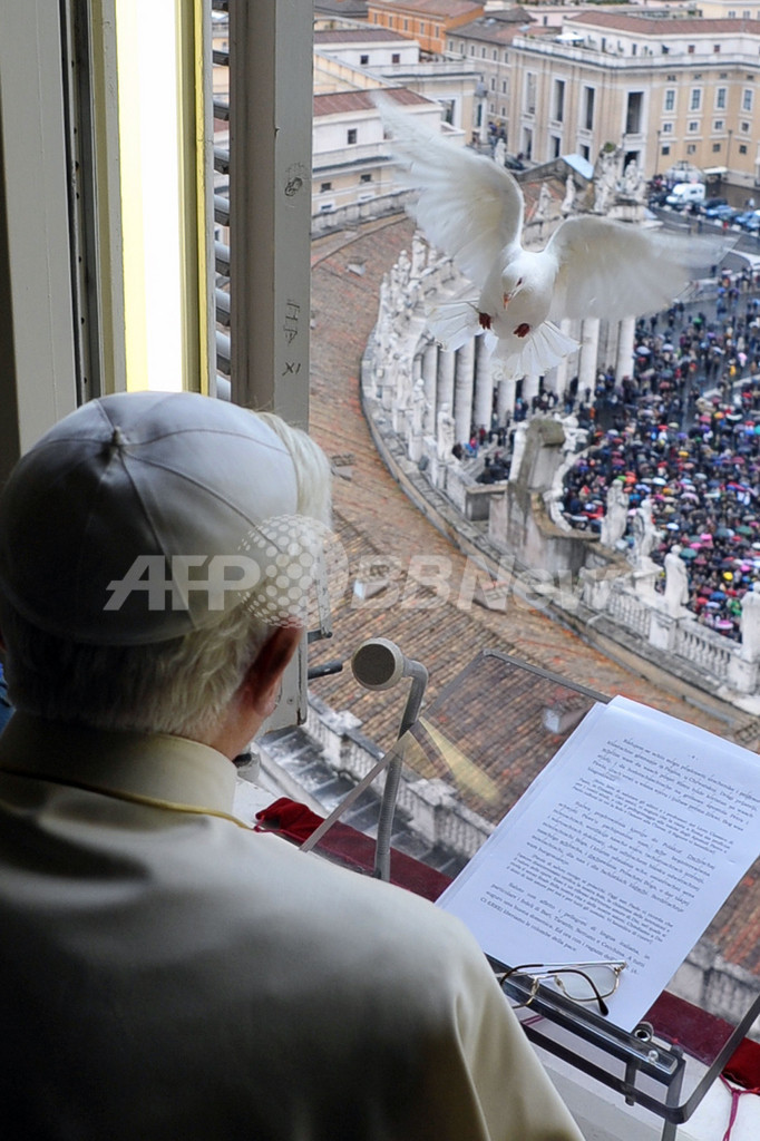 【2月2日 AFP】ローマ法王庁(バチカン)のサンピエトロ広場(St. Peter's square)で前月31日に行われたローマ法王ベネディクト16世(Benedict XVI)による日曜の「お告げの祈り(Angelus)」で、法王の部屋から子どもたちと放った「平和の象徴」のハト2羽のうち、1羽が法王の部屋に戻ってきてしまうというハプニングがあった。(c)AFP