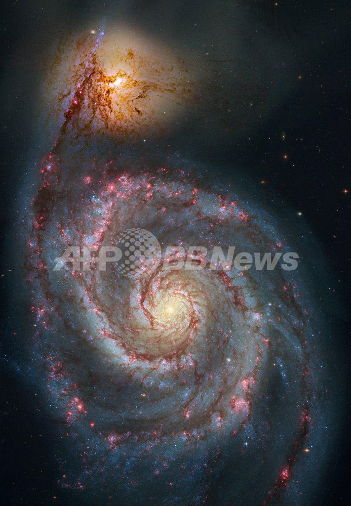 手前の巨大な渦巻銀河「NGC 5194」は幅が6万光年以上あり、背後の伴銀河「NGC 5195」と相互作用し合っている。M51は地球から約3100万光年離れたところにあり、北斗七星の「柄」の近くに位置する。(c)AFP