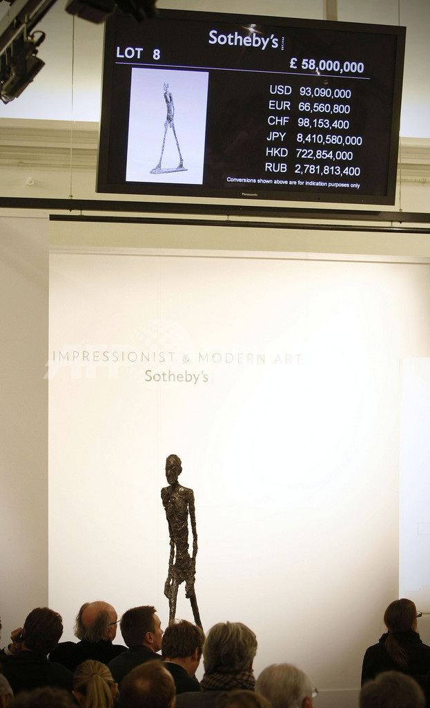 【2月4日 AFP】スイスの彫刻家アルベルト・ジャコメッティ(Alberto Giacometti)の作品「歩く男(L'homme qui marche I)」が3日、ロンドン(London)で行われた競売大手サザビーズ(Sotheby's)のオークションに出品され、美術品としては過去最高額となる6500万1250ポンド(約94億円、手数料込み)で落札された。