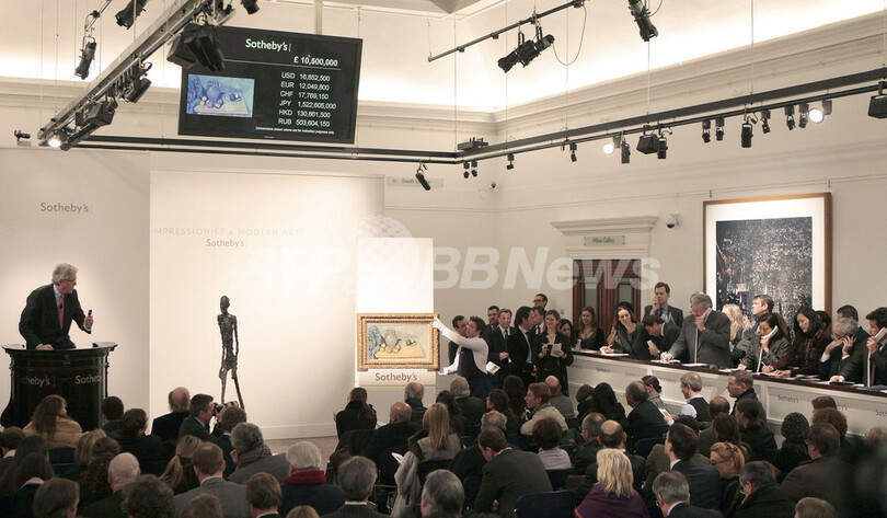 サザビーズによると、この落札額は、2004年に落札されたパブロ・ピカソ(Pablo Picasso)の絵画「パイプを持つ少年(Garcon a la Pipe)」に付けられた1億420万ドルを抜き、美術品の落札額としては史上最高額だという。(c)AFP/Sam Reeves