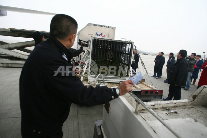 【2月6日 AFP】米国生まれの2頭のパンダが5日、特別機で中国四川(Sichuan)省に到着した。 到着したのは4年半前にワシントンD.C.(Wasihngton D.C.)のスミソニアン国立動物園(Smithsonian National Zoo)で生まれたオスのタイシャン(Tai Shan、泰山)と、3年前にアトランタ動物園(Atlanta Zoo)で生まれたメスのメイラン(Mei Lan、美蘭)。当初はそれぞれ2歳になった時点で中国に返還されることになっていたが、期限が延長されていた。 中国のテレビ局は、米バージニア(Virginia)州のダレス国際空港(Dulles International Airport)から2頭を運んできた米輸送大手フェデックス(FedEx)の特別機「フェデックス・パンダ・エクスプレス(FedEx Panda Express)」が四川省の省都、成都(Chengdu)の空港に到着する模様を生中継した。 このパンダのイラストが塗装されたボーイング777(Boeing 777)型機から特別製のケージが運び出されると、積み込まれた75キロのササをパンダが食べる様子を撮影しようと、大勢のカメラマンが押し寄せた。 このところ米中関係は、インターネット検索大手グーグル(Google)の検閲問題や台湾への米国製武器売却をめぐり緊張が高まっているが、在中国米大使館は、2頭のパンダは米中関係において特別な地位を占めているというデイビッド・ブラウン(David Brown)在成都米国総領事の声明を発表した。中国は冷戦時代から巨額のレンタル料を受け取ってパンダを貸し出す「パンダ外交」を展開してきた。 2頭は今後、中国のパンダ繁殖計画に加えられる。メイランにふさわしいお婿さんを一般の人が投票できるウェブサイトも出来ているが、彼女の気に入るオスがいなければ人工授精に切り替えるという。 また、米国生まれのパンダたちが中国人飼育員の指示を理解できるよう、タイシャンが暮らすことになる四川省の臥龍(Wolong)パンダ保護研究センターでは、英語を話せる職員が米国の飼育員と協力して飼育にあたることになっている。(c)AFP/Susan Stumme