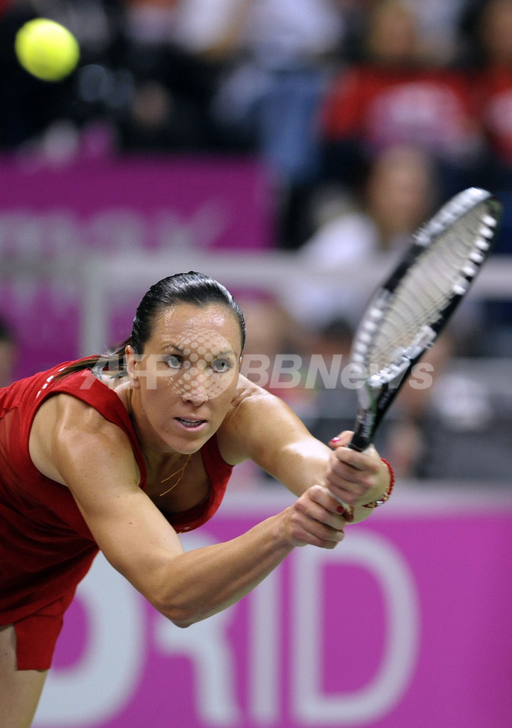 セルビアはアナ・イワノビッチ(Ana Ivanovic)が第1試合のシングルスでスベトラナ・クズネツォワ(Svetlana Kuznetsova)に1-6、4-6で敗れたが、続く第2試合のシングルスでエレナ・ヤンコビッチ(Jelena Jankovic)がアリサ・クレイバノワ(Alisa Kleybanova)に4-6、6-4、6-0で逆転勝ちし、対戦成績を1勝1敗の五分に戻した。(c)AFP/Chris Wright