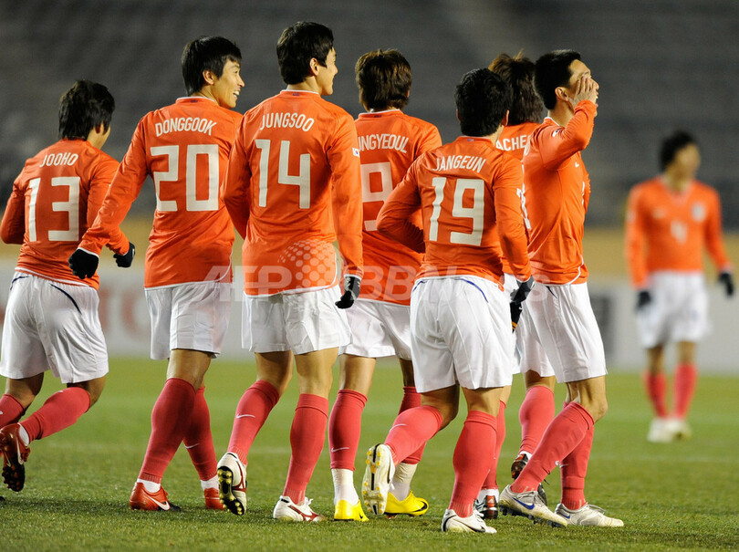 韓国は前半10分に金正友(Kim Jung-Woo、キム・ジョンウ)の得点で先制すると、同24分に具滋哲(Koo Ja-Cheol、ク・ジャチョル)、同32分に李同国(Dong Gook Lee、イ・ドングク)、同37分に李昇烈(Lee Seung-Yeoul、イ・スンリョル)の得点で加点し、前半だけで4点を奪った。(c)AFP
