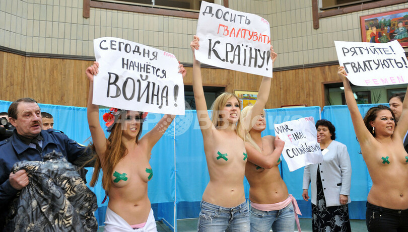 ウクライナの女性団体、大統領選投票所でセミヌード抗議