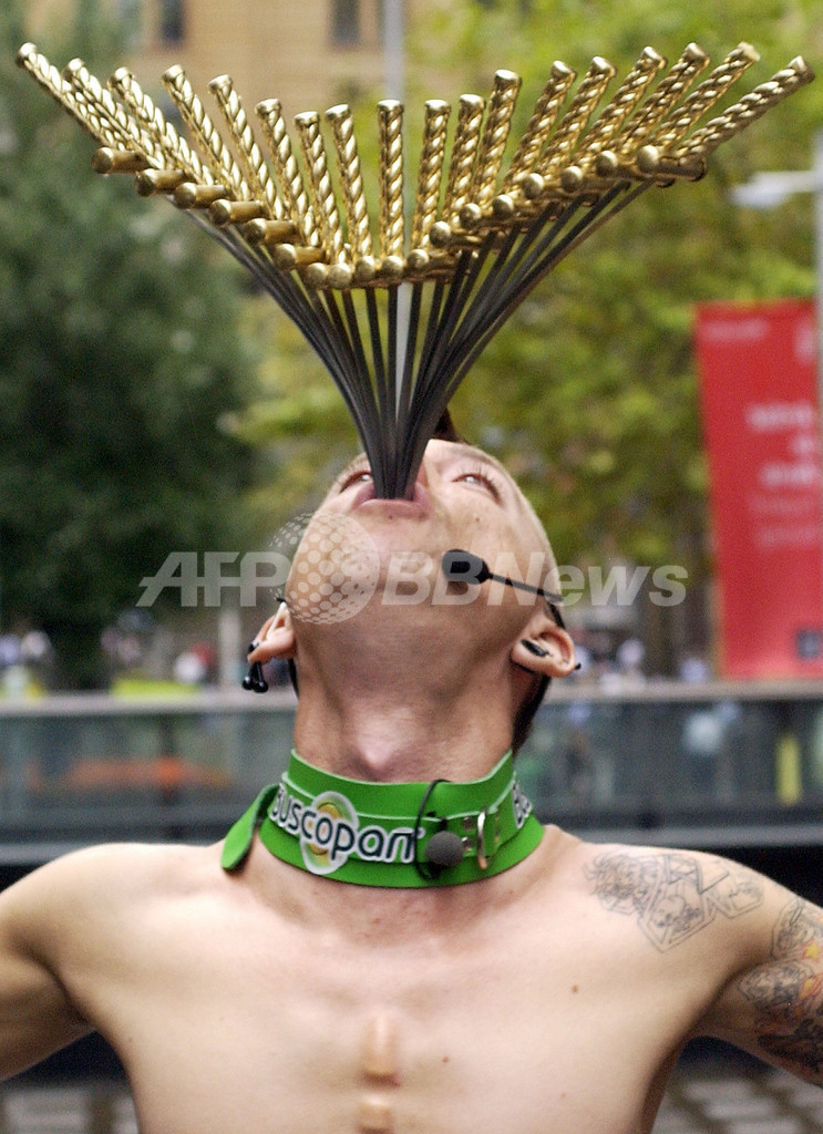 【2月9日 AFP】世界的に知られるオーストラリアの大道芸人で、「スペース・カウボーイ」の異名を持つシェイン・ハルトグレン(Chayne Hultgren)さんが8日、シドニー(Sydney)のシドニー・オペラハウス(Sydney Opera House)前で、ギネス世界記録(Guinness World Record)に挑戦し、剣18本を飲み込んだ。28日の「International Sword Swallowing Day(国際剣飲みデー)」を前に、ハルトグレンさんは長さ50.8センチ、幅1.3センチの剣を18本、同時に飲み込み、自らが保持する世界記録を見事塗り替えた。(c)AFP