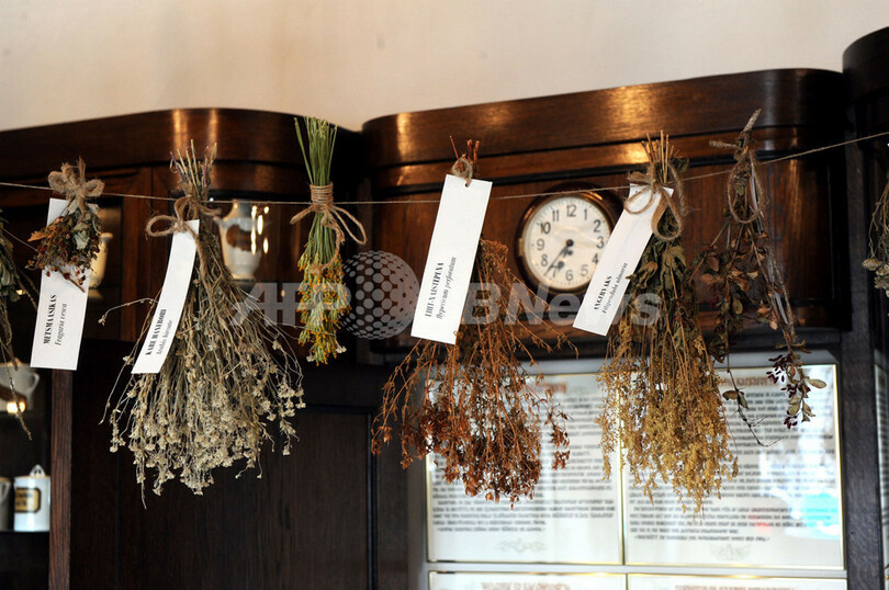 薬局を訪れる観光客の間で一番人気の秘伝の薬は「クラレット(Klaret)」と呼ばれるワインの一種だ。アルコール度数14%で8種類のスパイスが入っている。450ミリリットルの瓶入りで価格は16ユーロ(約1960円)だ。このほかに現代医学の治療薬も扱っている。(c)AFP/Anneli Reigas