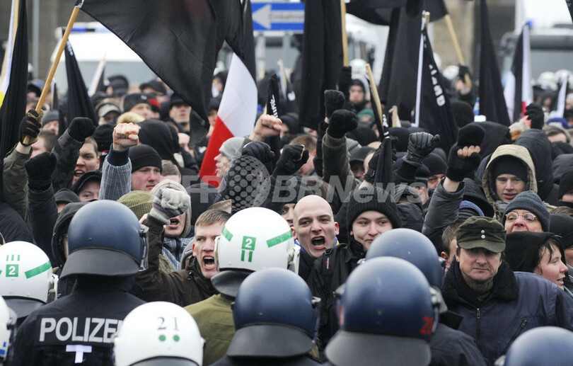 この日、追悼集会を企画したネオナチ団体6400人あまりがノイシュタット(Neustadt)駅前に集結。数人が演説を行った後、デモ行進に向かおうとしたが、市民団体メンバーら1万2000人の「人間の鎖」に行く手を阻まれた。