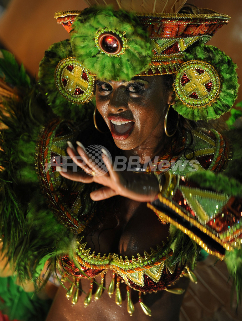 写真は、カーニバルで踊るサンバチーム「インペラトリス・レオポウジネンセ(Imperatriz Leopoldinense)」の女性メンバー(2010年2月14日撮影)。(c)AFP/VANDERLEI ALMEIDA