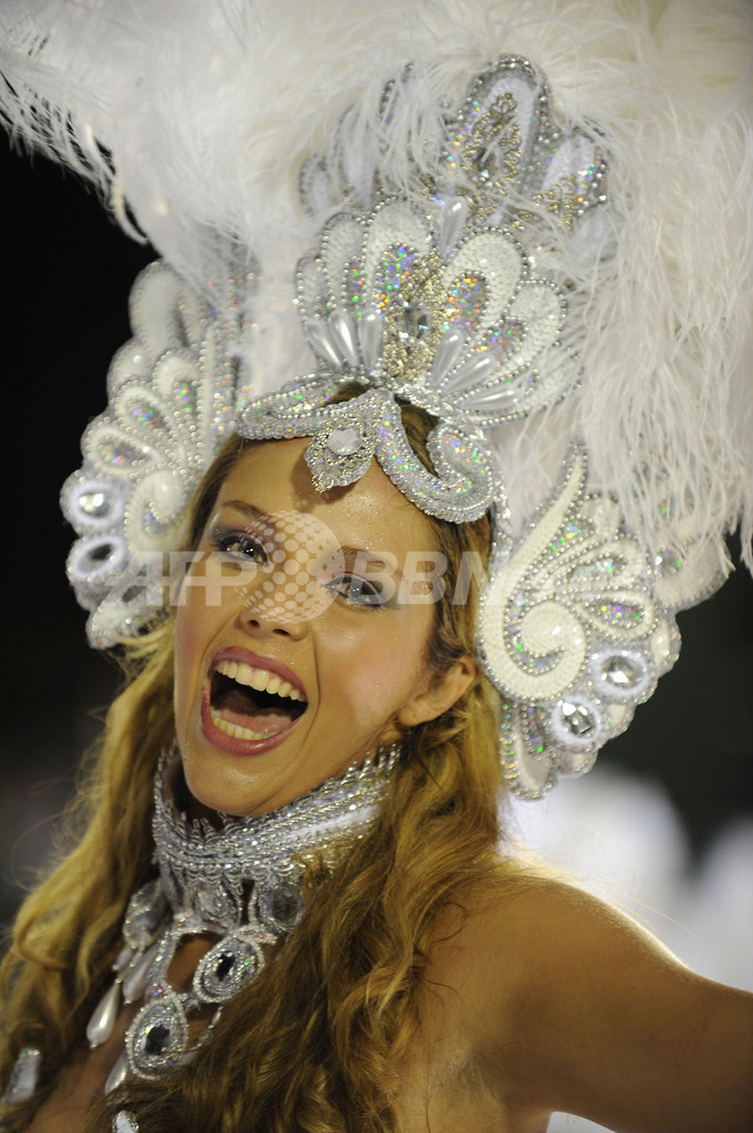 写真は、カーニバルで踊るサンバチーム「インペラトリス・レオポウジネンセ(Imperatriz Leopoldinense)」の女性メンバー(2010年2月14日撮影)。(c)AFP/VANDERLEI ALMEIDA