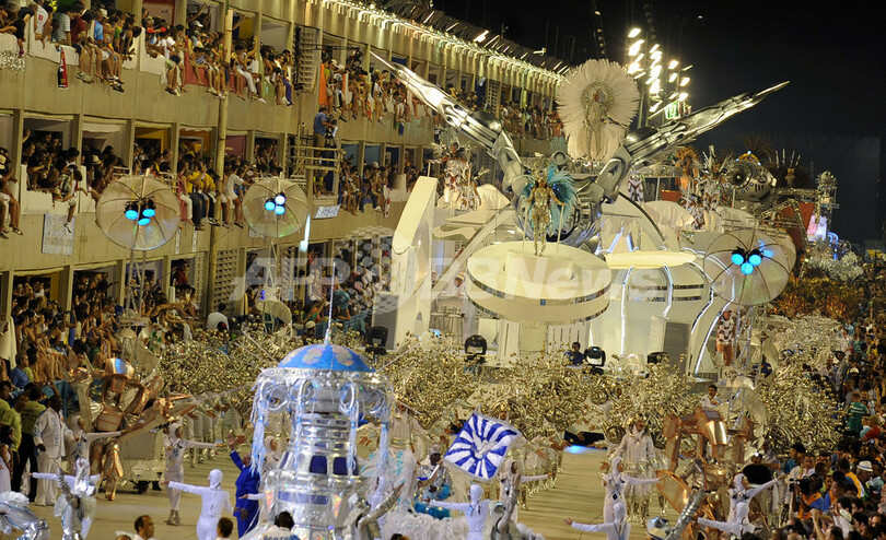 写真は、サンボドロムでパフォーマンスを披露するサンバチーム「Portela」(2010年2月16日撮影)。(c)AFP/VANDERLEI ALMEIDA