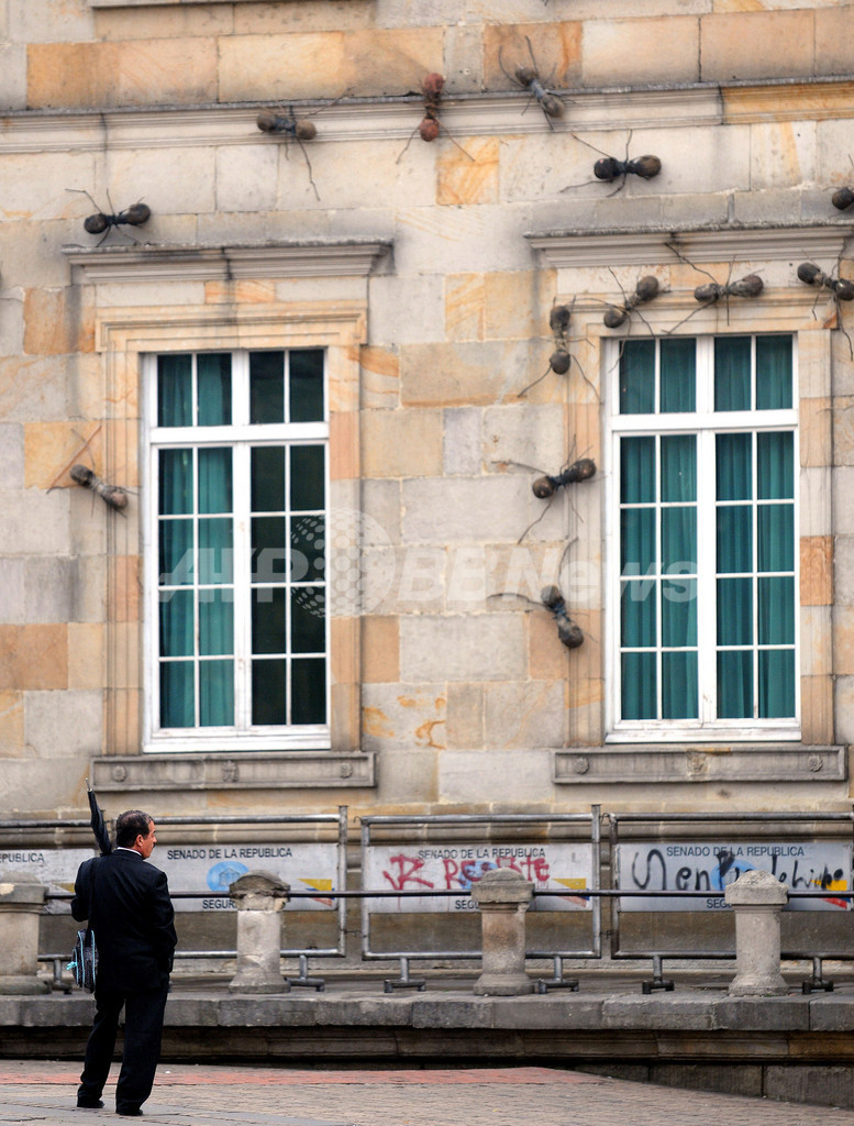 ニュース ライフ コロンビアの国会議事堂にアリの大群? 2010年2月17日 23:32 発信地:ボゴタ/コロンビア [ 中南米 コロンビア ] このニュースをシェア ‹ › ❮ 11/13 ❯ コロンビアの首都ボゴタ(Bogota)で16日、国会議事堂の壁面に巨大なアリの群れがはい回るアート作品が展示された。コロンビア人アーティスト、Rafael Gomezbarrosさんの作品。アリは、紛争の続くコロンビアで避難民となった人びとを象徴しているという。(2010年2月16日撮影)。(c)AFP/Rodrigo ARANGUA 画像作成中 ! 【2月17日 AFP】コロンビアの首都ボゴタ(Bogota)で16日、国会議事堂の壁面に巨大なアリの群れがはい回るアート作品が展示された。(c)AFP ライフ 一覧へ> メディア・報道関係・法人の方向け 写真・動画 購入のお問合せ>