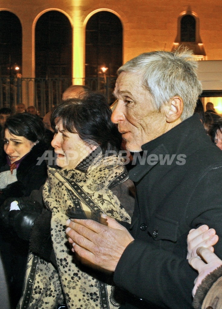 写真は、トビリシの空港で息子の無言の帰国を迎えるクマリタシビリ選手の父親(右、2010年2月17日撮影)。(c)AFP/VLADIMIR VALISHVILI