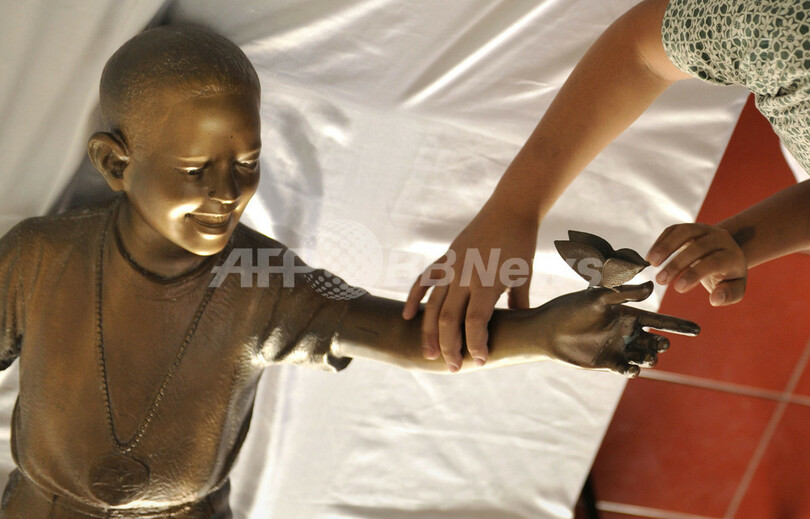 写真は、学校に到着した「オバマ少年像」をさわる子ども(2010年2月16日撮影)。(c)AFP/ROMEO GACAD