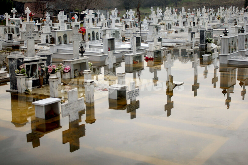 写真は、Lavara村で冠水した墓地(2010年2月17日撮影)。(c)AFP/Sakis Mitrolidis