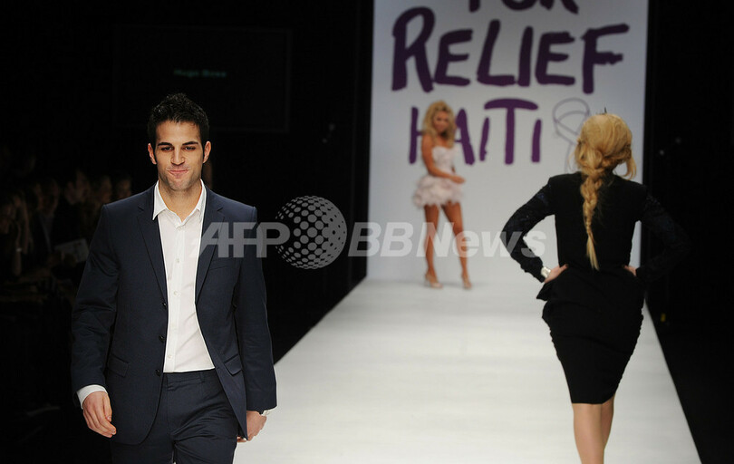 ほかにも、歌手のジェリ・ハリウェル(Geri Halliwell)やDJ/タレントのピクシー・ゲドルフ(Pixie Geldof)、アーセナルのセスク・ファブレガス(Cesc Fabregas)選手ら各界から集ったセレブリティたちがモデルとしてランウェイに登場した。(c)AFP