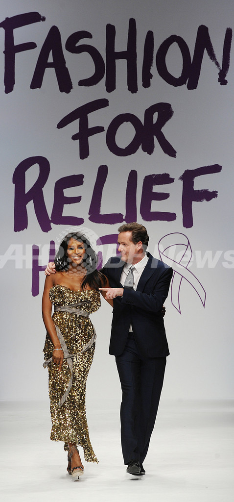 ほかにも、歌手のジェリ・ハリウェル(Geri Halliwell)やDJ/タレントのピクシー・ゲドルフ(Pixie Geldof)、アーセナルのセスク・ファブレガス(Cesc Fabregas)選手ら各界から集ったセレブリティたちがモデルとしてランウェイに登場した。(c)AFP