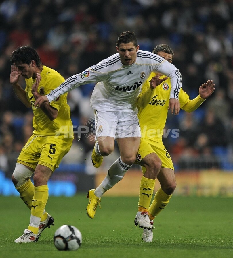 ビジャレアルはニウマール(Honorato da Silva Nilmar)のゴールで再び1点差に迫ったが、レアル・マドリードは後半26分にマルセロ(Marcelo Vieira Da Silva Junior)の左サイドからのクロスにイグアインが合わせて突き放すと、終盤にはカカ、シャビ・アロンソ(Xabi Alonso)のPKで追加点を挙げ、アウェーでオリンピック・リヨン(Olympique Lyon)に0-1で敗れた16日の欧州チャンピオンズリーグ2009-10(UEFA Champions League 2009-10)決勝トーナメント1回戦から立て直した。(c)AFP/Tim Hanlon