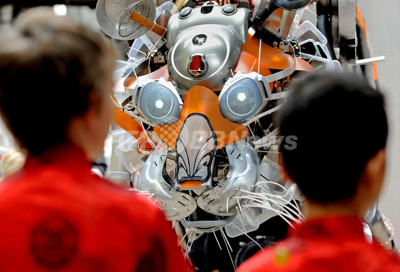 写真は、テスト走行を行う「メカ・タイガー」の山車(2010年2月19日撮影)。(c)AFP/Greg WOOD