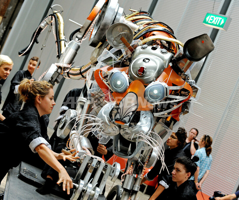 写真は、テスト走行を行う「メカ・タイガー」の山車(2010年2月19日撮影)。(c)AFP/Greg WOOD