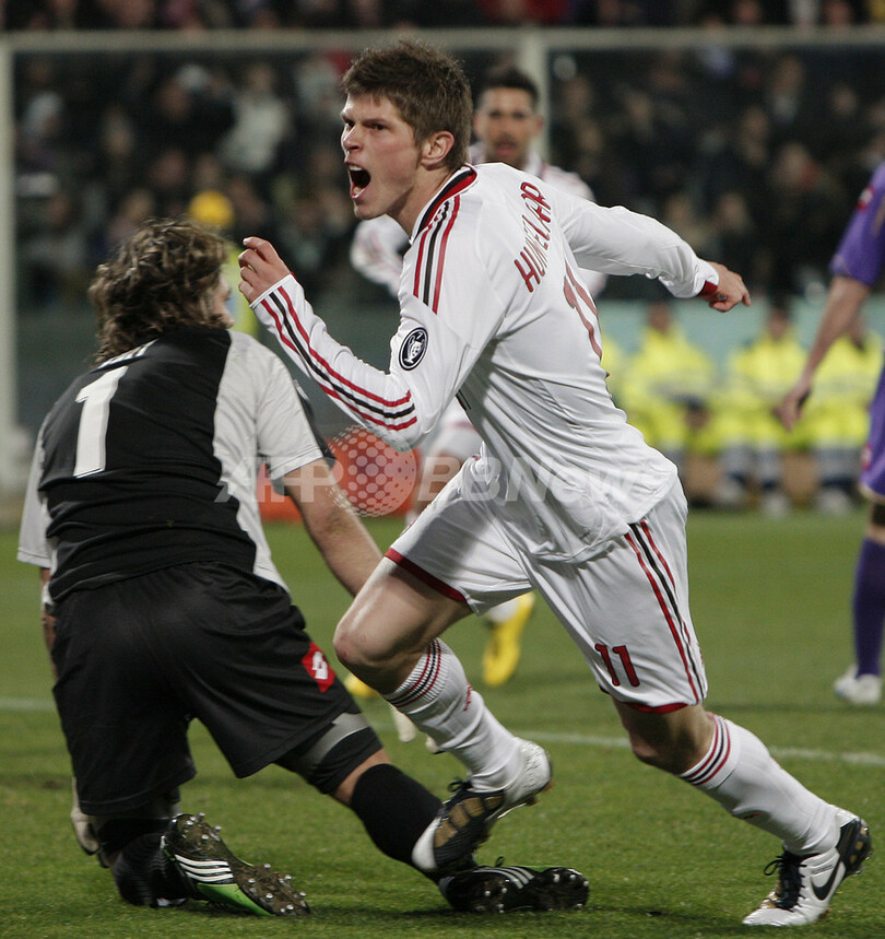 前半14分にアルベルト・ジラルディーノ(Alberto Gilardino)に先制点を奪われ、試合終盤までフィオレンティーナに1点のリードを許していたミランは、後半36分に途中出場のクラース・ヤン・フンテラール(Klaas-Jan Huntelaar)の得点で同点に追いつくと、終了間際にパトが逆転ゴールを奪った。(c)AFP/Barnaby Chesterman