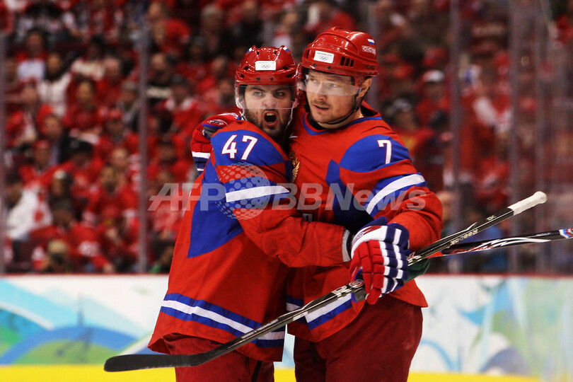 写真は得点を決め、アレクサンダー・ラドロフ(%%Alexander Radulov%%)と喜ぶロシアのドミトリ・カリニン(Dmitri Kalinin%%、右)。(2010年2月24日撮影)(c)AFP/Getty Images/Bruce Bennett