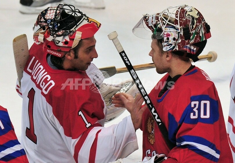 写真は試合後にロシアのイリヤ・ブリズガロフ(%%Ilya Bryzgalov%%)と握手を交わすカナダのロベルト・ルオンゴ(%%Roberto Luongo%%、左)。(2010年2月24日撮影)(c)AFP/CRIS BOURONCLE