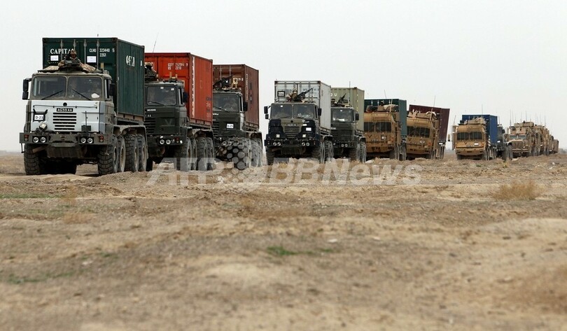 写真は、マルジャから約10キロのNad-e-Aliに物資を運ぶ英軍のトラックの列(2010年2月24日撮影)。(c)AFP/THOMAS COEX