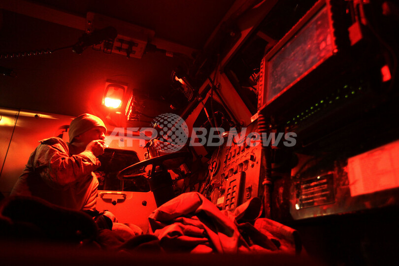 写真は、マルジャの北東近郊Trikh Nawarに設営された海兵隊の前哨地に止めた装甲車(MRAP)の車内でたばこを吸う米軍の兵士(2010年2月22日撮影)。(c)AFP/PATRICK BAZ