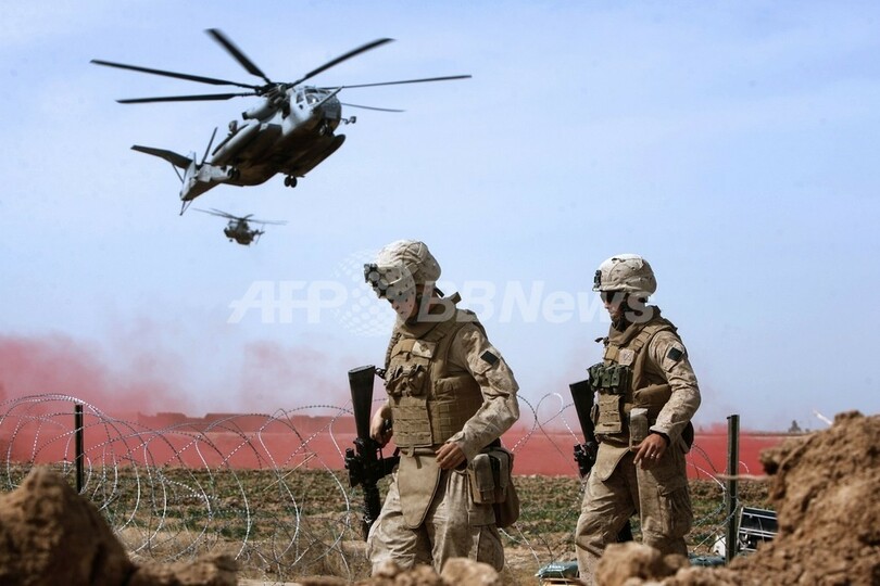 写真は、マルジャに着陸する米海兵隊のヘリコプター(2010年2月25日撮影)。(c)AFP/PATRICK BAZ