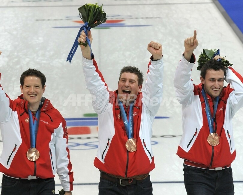 写真はメダル授与式で歓声に応える銅メダルを獲得したスイスの(左から)%%Simon Struebin%%、%%Markus Eggler%%、%%Jan Hauser%%、。(2010年2月27日撮影)(c)AFP/TOSHIFUMI KITAMURA