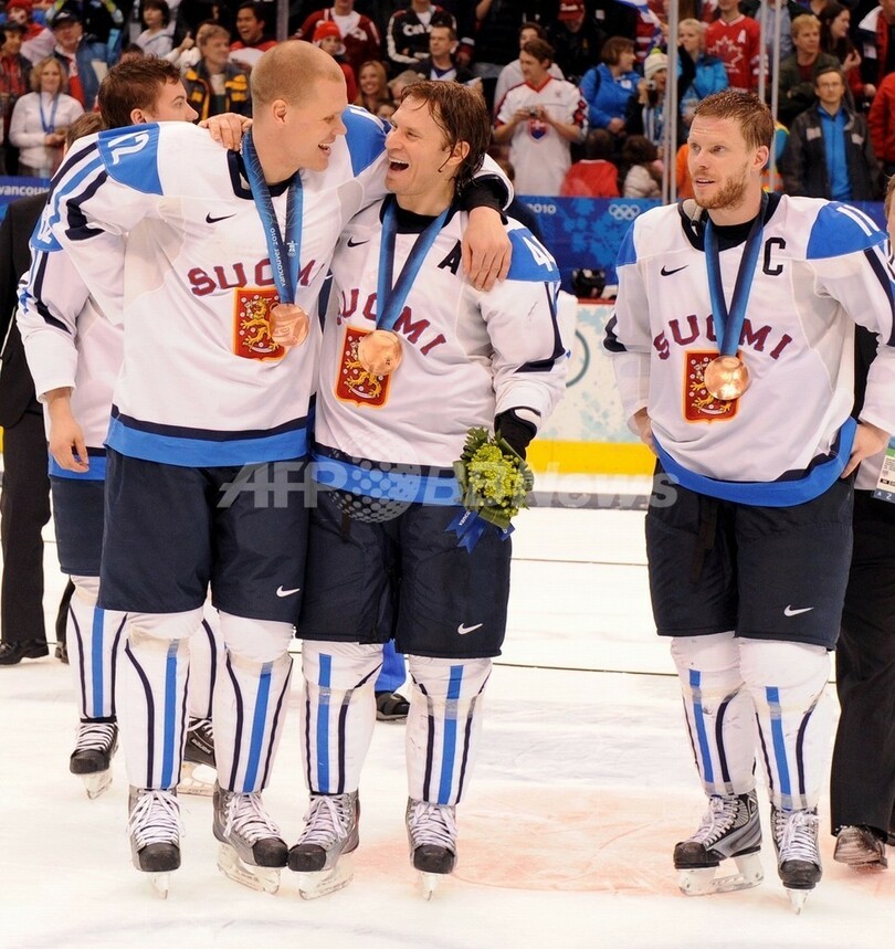 写真は銅メダル獲得を喜ぶフィンランドの(左から)オリ・ヨキネン、キモ・ティモネン(%%Kimmo Timonen%%)、サク・コイブ(%%Saku Koivu%%)。(2010年2月27日撮影)(c)AFP/LUIS ACOSTA
