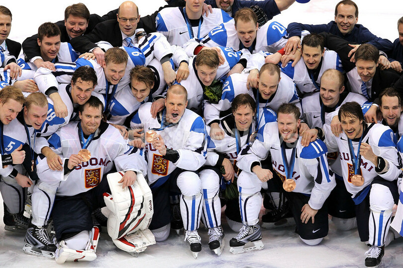 写真は銅メダル獲得を喜ぶフィンランドの選手。(2010年2月27日撮影)(c)AFP/Getty Images/Jamie Squire