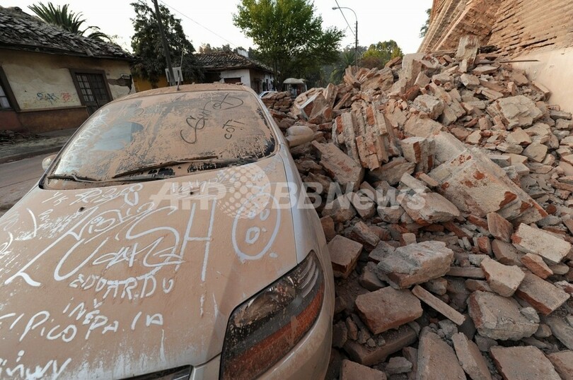 国連によると本震後の余震は51回に上り、震度もマグニチュード(M)4.9~6.9といまだ警戒が必要だ。震源地からある程度離れていたサンティアゴでは、市中心部の大教会と国際空港に大きな損傷を受けた以外、多くの建物は外からは異状なく見えるが、内部の壁や床は崩れ落ち、備品は砕け散っている。市民600万人の多くは余震を恐れて屋外にとどまっている。今回の地震による死者は300人を超えるとみられている。(c)AFP/Moises Avila