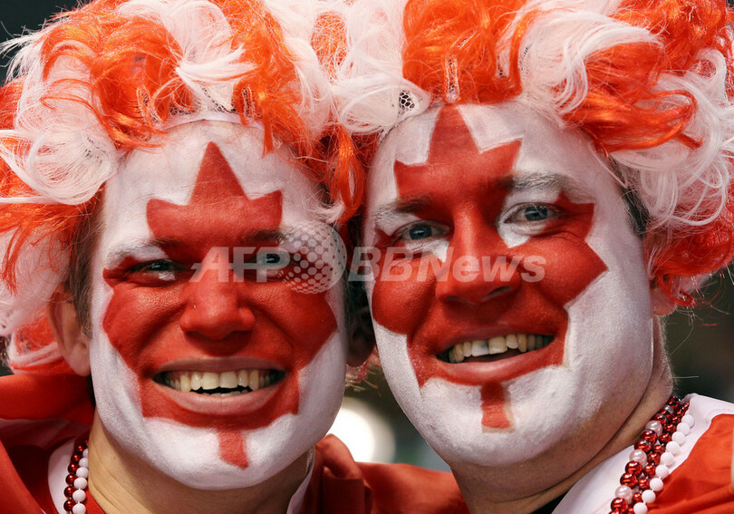 写真は顔にペイントを施してカナダを応援するファン。(2010年2月28日撮影)(c)AFP/Getty Images/Bruce Bennett