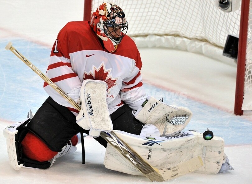写真はショットをセーブするカナダのロベルト・ルオンゴ(%%Roberto Luongo%%)。(2010年2月28日撮影)(c)AFP/CRIS BOURONCLE