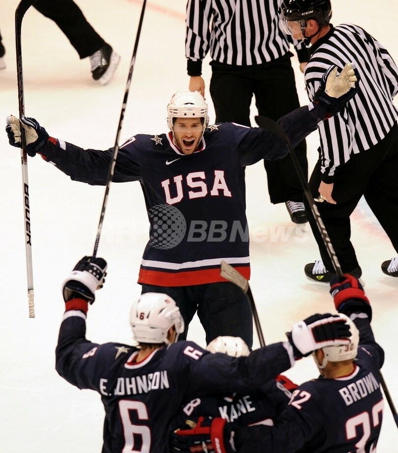 写真は第2ピリオドに得点を決めて歓喜する米国のライアン・ケスラー(%%Ryan Kesler%%)。(2010年2月28日撮影)(c)AFP/YURI KADOBNOV