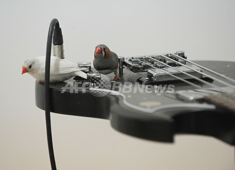 ギャラリー内の特設スペースに放たれたキンカチョウは40匹。部屋の中にはベースやギター、シンバルなどが置かれ、鳥たちが動き回ることで生まれる音色がアンプを通して流れる。(2010年2月26日撮影)。(c)AFP/Carl de Souza