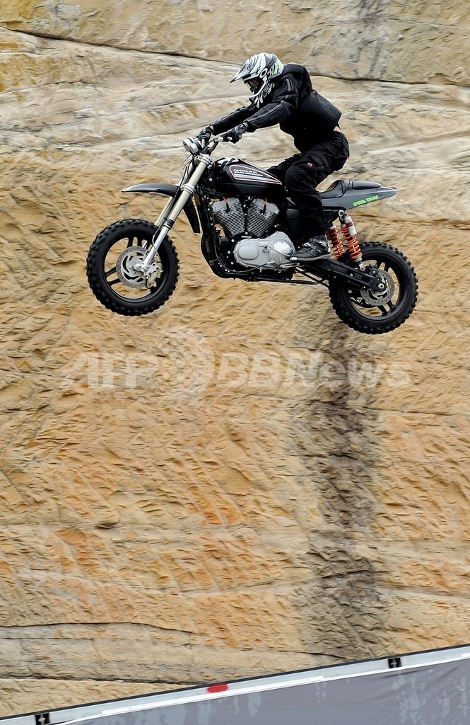 バイクジャンプでは、米国の伝説的なスタントマン、エベル・ニーベル(Evel Knievel)さんが1975年、オハイオ(Ohio)州キングスアイランド(King's Island)で14台のバスを飛び越えた記録が有名。このわずか数か月前、ニーベルさんは英ロンドンのウェンブリー・スタジアム(Wembley Stadium)でバイクジャンプを失敗してクラッシュしていた。(c)AFP