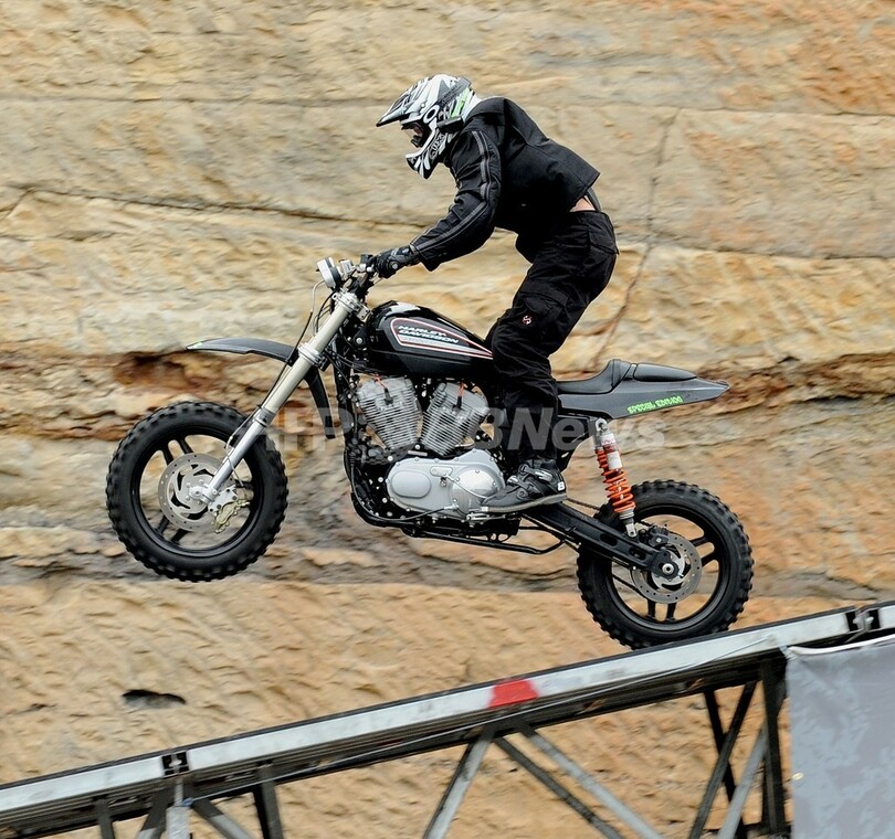 バイクジャンプでは、米国の伝説的なスタントマン、エベル・ニーベル(Evel Knievel)さんが1975年、オハイオ(Ohio)州キングスアイランド(King's Island)で14台のバスを飛び越えた記録が有名。このわずか数か月前、ニーベルさんは英ロンドンのウェンブリー・スタジアム(Wembley Stadium)でバイクジャンプを失敗してクラッシュしていた。(c)AFP