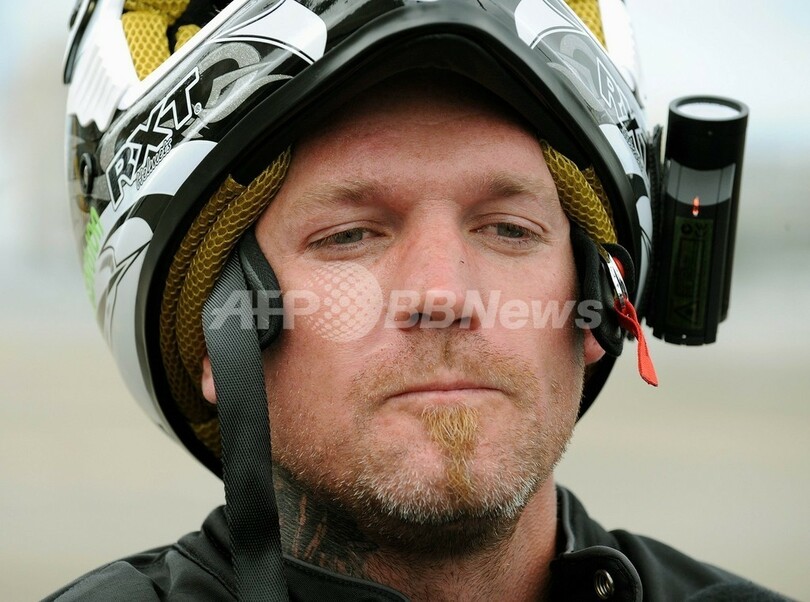 バイクジャンプでは、米国の伝説的なスタントマン、エベル・ニーベル(Evel Knievel)さんが1975年、オハイオ(Ohio)州キングスアイランド(King's Island)で14台のバスを飛び越えた記録が有名。このわずか数か月前、ニーベルさんは英ロンドンのウェンブリー・スタジアム(Wembley Stadium)でバイクジャンプを失敗してクラッシュしていた。(c)AFP