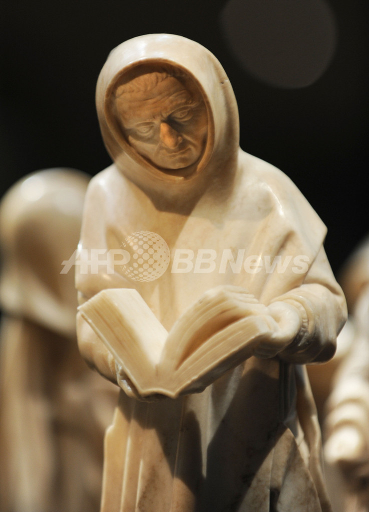 米ニューヨーク(New York)のメトロポリタン美術館(Metropolitan Museum of Art)で2日、15世紀に欧州で制作された雪花石こうの彫像などを展示した展覧会「The Mourners: Medieval Tomb Sculptures from the Court of Burgundy」が開幕した。これら37体の彫像は、フランス・ディジョン(Dijon)にあるブルゴーニュ公ジャン1世(John the Fearless)の墓に納められていたもので、当時の彫刻家が25年にわたって制作した。それぞれが、嘆き悲しむ司教や修道士、聖歌隊の少年などを表している。ディジョンの外に持ち出されたのは今回が初めて。写真は、同展に展示された彫像(2010年3月1日撮影)。(c)AFP/Stan Honda